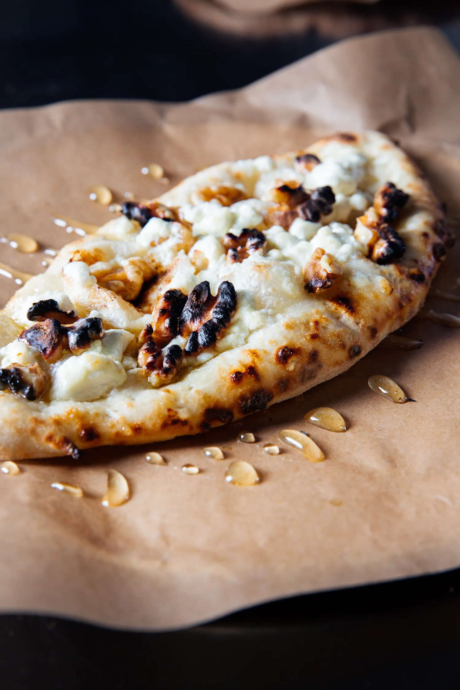 Flatbread Neapolitan dough with goat cheese, honey, and crushed walnuts.